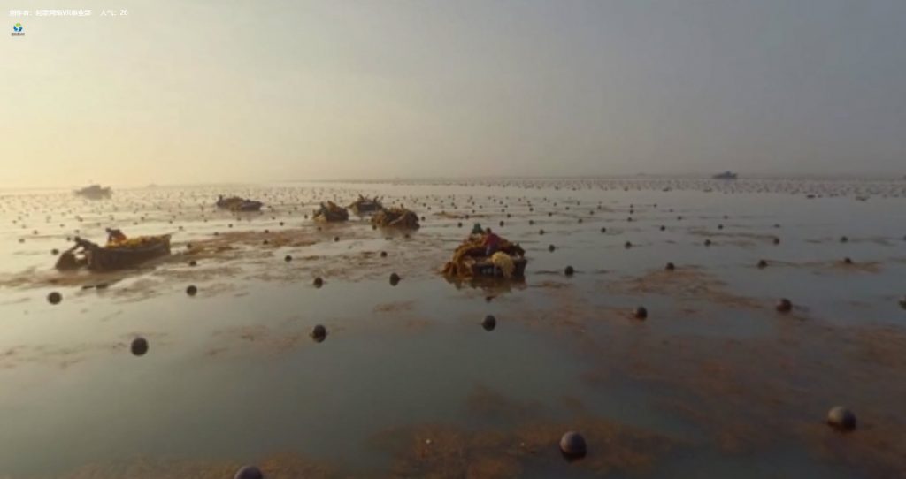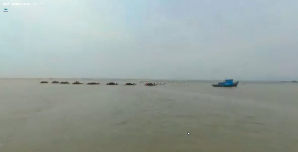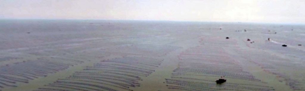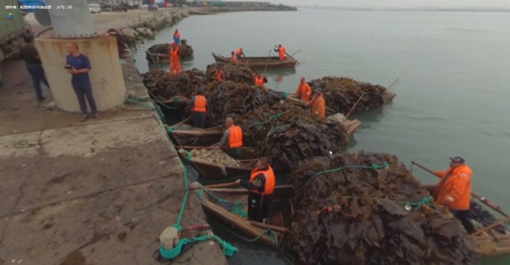 A tug boat pulls as many as 7 fully loaded harvest boats